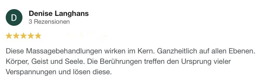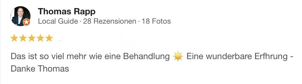 „Nach einem Sturz im Oktober war meine linke Schulter wochenlang schmerzhaft und in der Bewegung stark eingeschränkt. Anfang Dezember hatte ich eine Behandlung bei Thomas – und bereits während der Stunde fühlte ich eine deutliche Entlastung. Mein Brustkorb wurde weiter, die Atmung tiefer, und eine wohltuende Wärme begann, die überlasteten Bereiche zu lösen. In den Tagen danach setzte sich dieser Effekt fort: Die Beweglichkeit kehrte spürbar zurück, und die Schmerzen wurden immer weniger. Ich bin sehr dankbar für diese Behandlung und kann Thomas wärmstens empfehlen.“